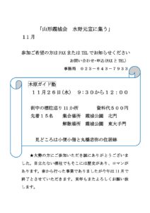 ← Back to イベント 霞城公園北門 + Google マップ 霞城町1−7 山形市, 山形県 日本 イベントリストナビゲーション 次のイベント » 2025年11月 木原ガイド塾 街中の標柱巡り(山形霞城会 水野元宣に集う) 11月 26日09:30 - 12:00 霞城公園北門, 霞城町1−7 山形市, 山形県 日本 + Google マップ 500円 チラシはこちらからダウンロードできます(PDF) さらに詳しく » + Export Events