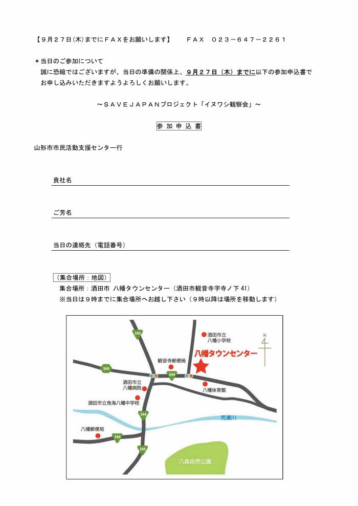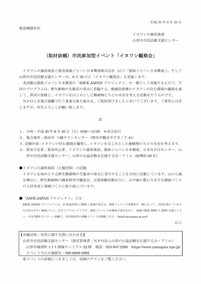 « 前の記事へ 次の記事へ » 2018.9.20-プレスリリース「SAVE JAPAN プロジェクト 2017-2018「イヌワシ観察会」」 2018年9月21日 center PDFのダウンロードはこちらから イベント詳細のURL:SAVE JAPAN プロジェクト 2017-2018「イヌワシ観察会」 « 前の記事へ 次の記事へ »