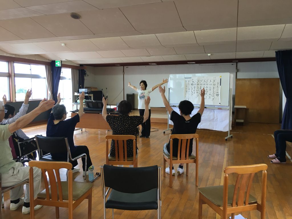 令和元年7月16日(火)10時から、山形市西山形コミュニティセンターで、「遊びり会」が開催されました。今年度から音楽療法を取り入れて心と体のリハビリを体験されているとのことです。会場は西山形コミュニティセンターで、山形市内の西部に位置し、標高も中心部より高くて、山形市内がきれいに見渡せる素敵な場所でした。