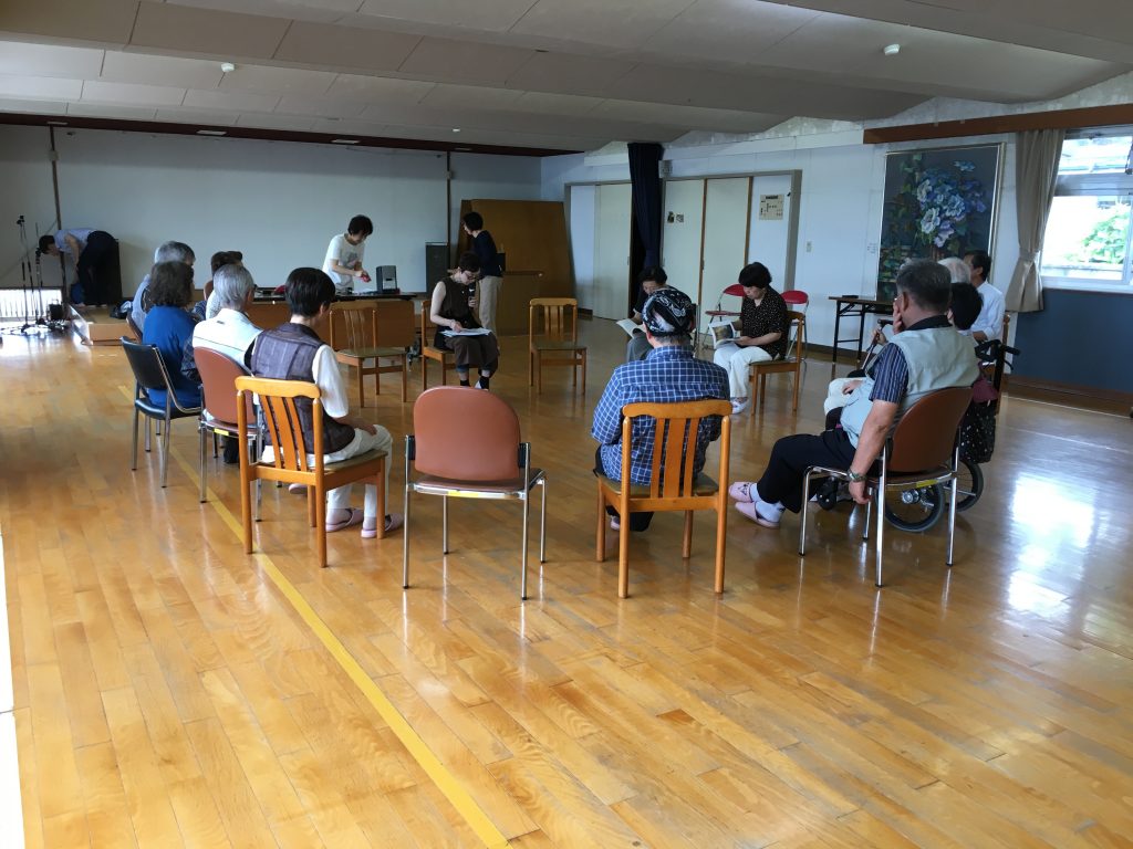 後半は、参加者が丸くなって座り、一人ずつ「自分にとっていいこと」や近況を話しました。毎朝草取りをしていること、都会の真ん中で入院したこと、友達が何年かぶりに会いに来てくれたこと、家事をして支えてくれる夫への感謝の言葉、オリンピックを楽しみにしていること等、聞いていても元気がもらえるような前向きな言葉が続きました。