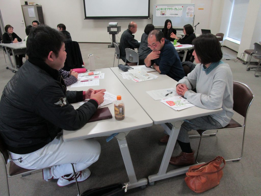 山形市内とその近郊の4つの団体が、居場所づくりの活動の様子を発表しました。参加された方たちは熱心にメモを取っています。部屋の片隅には各団体のリーフレットやチラシが並べられています。その後は質問や交流の時間です。各グループごとに活発な話し合いが行われました。資金はどうしているのか、スタッフはどんな人がやっているのか、場所はどんなところでやっているのか、どんな人が何人くらい来るのか、課題や成果はどんな事が挙げられるかなど、ワイワイ話しながら進めていきました。