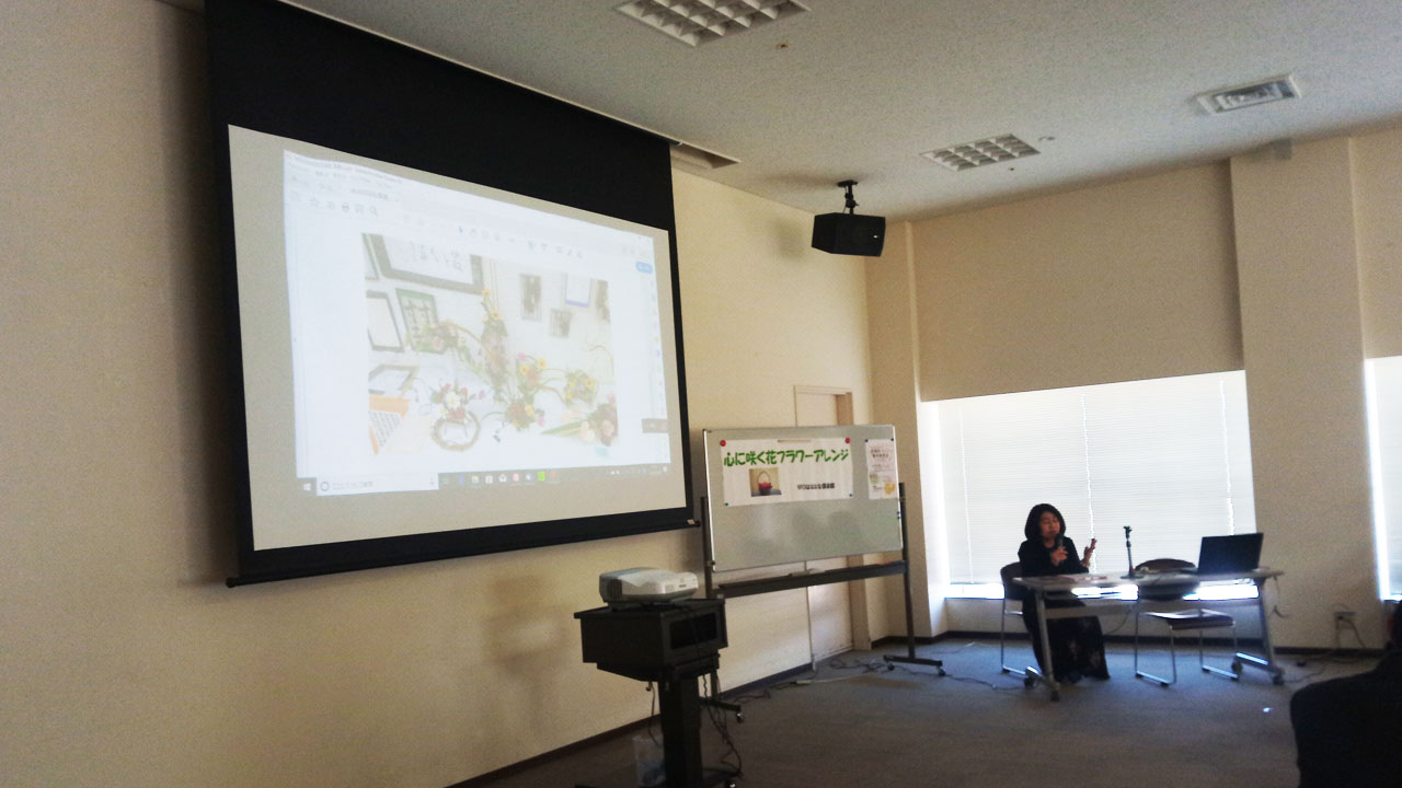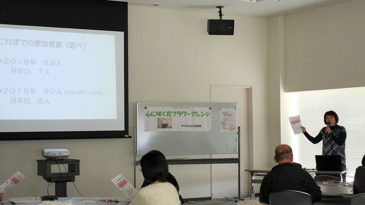 上山市で活動する「NPOはなはな倶楽部」では、自身のフラワーアレンジメントの経験を通して、はなカフェを行なっています。カフェではアレンジメントの技術以上に、ほっと一息できるような交流溢れる空間を大切にしています。代表者の吉田さん自身もこの活動をとても楽しみにしているそうです。