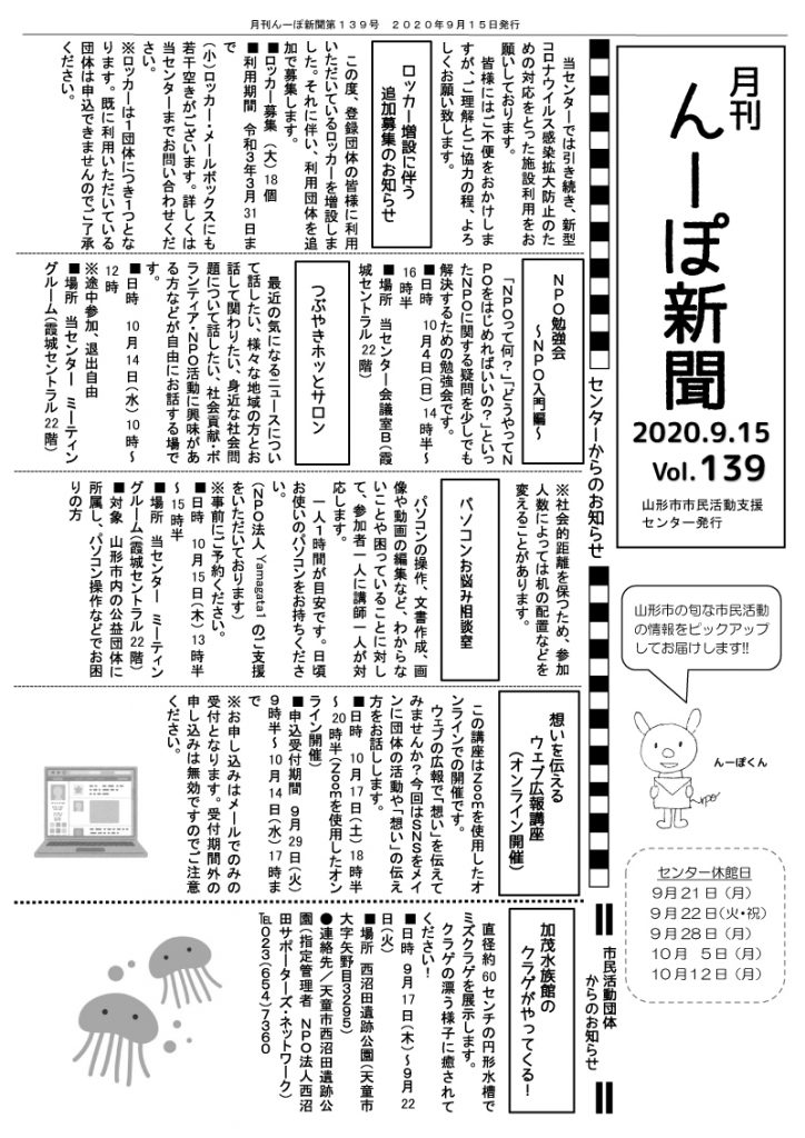 « 前の記事へ 次の記事へ » 月刊紙「んーぽ新聞」第139号 2020年9月15日 center PDFはこちらよりご覧になれます < 目 次 >・センターからのお知らせ・市民活動団体イベント情報・市民活動支援センターひとくちコラム、おすすめブックナビ <配布・設置にご協力をいただいている施設>・山形市役所企画調整課・山形市内各公民館、各コミュニティセンター(28施設)・山形市立図書館・山形市男女共同参画センター ファーラ・山形市社会福祉協議会に、設置のご協力をいただいております。いつもありがとうございます。 « 前の記事へ 次の記事へ »