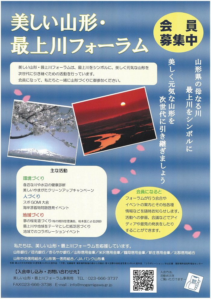 « 前の記事へ 次の記事へ » 美しい山形・最上川フォーラム 会員募集中 2020年9月24日 center 美しい山形・最上川フォーラムは、最上川をシンボルに、美しく元気な山形を次世代に引き継ぐための活動を行っています。 会員になって、私たちと一緒に山形づくりに御参加ください。 【入会申し込み・お問合わせ先】 美しい山形・最上川フォーラム事務局 TEL:023-666-3737 FAX:023-666-3738 Eメール: info@mogamigawa.gr.jp 入会についての詳細はこちらのページをご覧ください。 « 前の記事へ 次の記事へ »