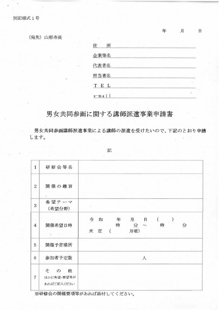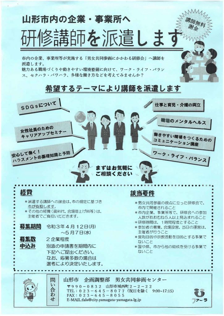 « 前の記事へ 次の記事へ » 山形市内の企業・事業所へ 研修講師を派遣します 2021年4月6日 center チラシのダウンロードはこちらから。 また、申請書はこちらからダウンロードください。 ●お問い合わせ 山形市 企画調整部 男女共同参画センター TEL:023-345-8077(祝日を除く 9:00~17:15) FAX:023-645-8055 E-MAIL:fala@city.yamagata-yamagata.lg.jp « 前の記事へ 次の記事へ »