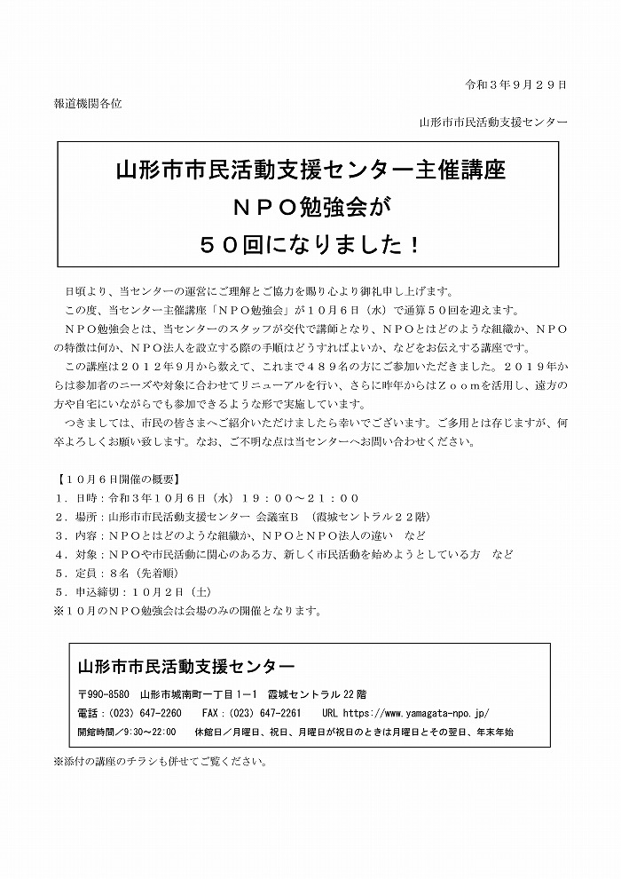 2021.9.29-プレスリリース 「NPO勉強会が50回になりました!」(お知らせ)