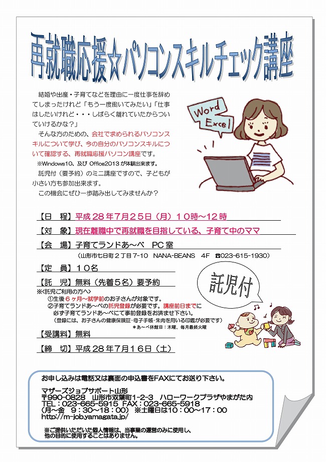 次の記事へ » 再就職応援 パソコンスキルチェック講座 0206年6月14日 center チラシはこちらからダウンロードできます(PDFデータ) リンク: マザーズジョブサポート山形 再就職応援 パソコンスキルチェック講座 次の記事へ »