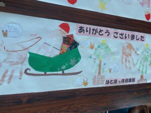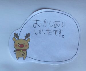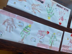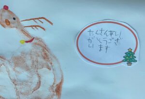 この日事業所を訪れていた子どもたちはおおよそ10人程度。皆思い思いのことをして遊んでいました。そのなかの何人かがお礼の手紙を作っているところを見せてもらいました。手のひらをスタンプにしてトナカイやツリーに見立てて、そこに子どもたちが書いたメッセージを貼り付けていくというカラフルで楽しい手紙です。それぞれ皆感謝を込めて一生懸命メッセージを書いていました。出来上がった手紙はお菓子を寄贈してくれた明治ホールディングスの株主の皆様に贈るのだそうです。きっと子供たちの気持ちは手紙と一緒に届けられ、そこからまたたくさんの笑顔が広がっていくことでしょう