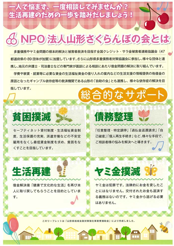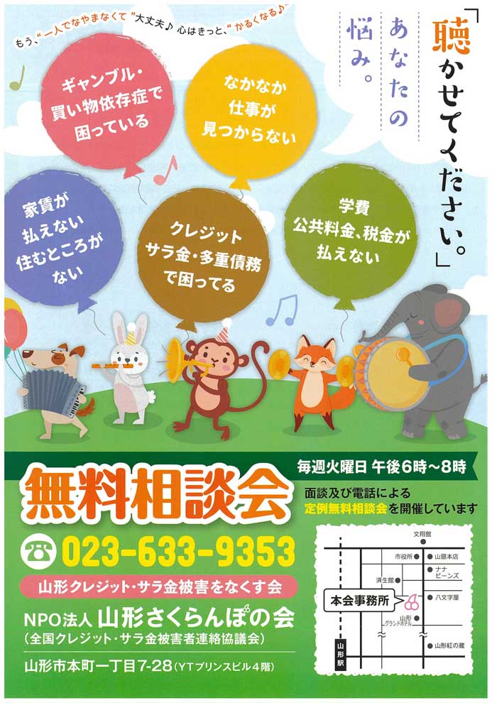 « 前の記事へ 次の記事へ » 「聴かせてください。」あなたの悩み 山形クレジット・サラ金被害をなくす会 無料相談会 毎週火曜日午後6時~8時 2024年3月12日 center チラシはこちらからダウンロード出来ます(PDF形式) « 前の記事へ 次の記事へ »
