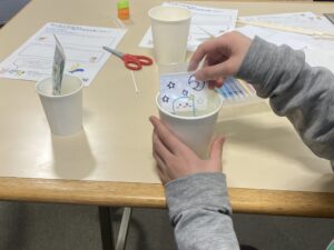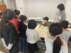 後半は、「絵を水の中に入れると、絵が変わる!?」というテーマで実験を行いました。まず始めに、ろうそくマジックを見てもらいました。これは燃えるろうそくのイラスト書いた紙を水の中に入れると火の部分が消えるというもので、子どもたちはもちろん、保護者も目を丸くして見てくれました。その後、種明かしをし、実際に作ってもらいました。袋には水に書いても残る絵、紙には水に書くと消える絵を書くというものです。子どもたちは飲み込みが早く、すぐに思い思いの絵を描き始めました。センターのオリジナルキャラクターのぴーちゃんが消える絵をかいてくれた子もいて、ナイスなアイデアだと逆に私たちが感動してしまいました。この実験をもとに家でもいろいろなマジックをしてもらえたら嬉しいです。