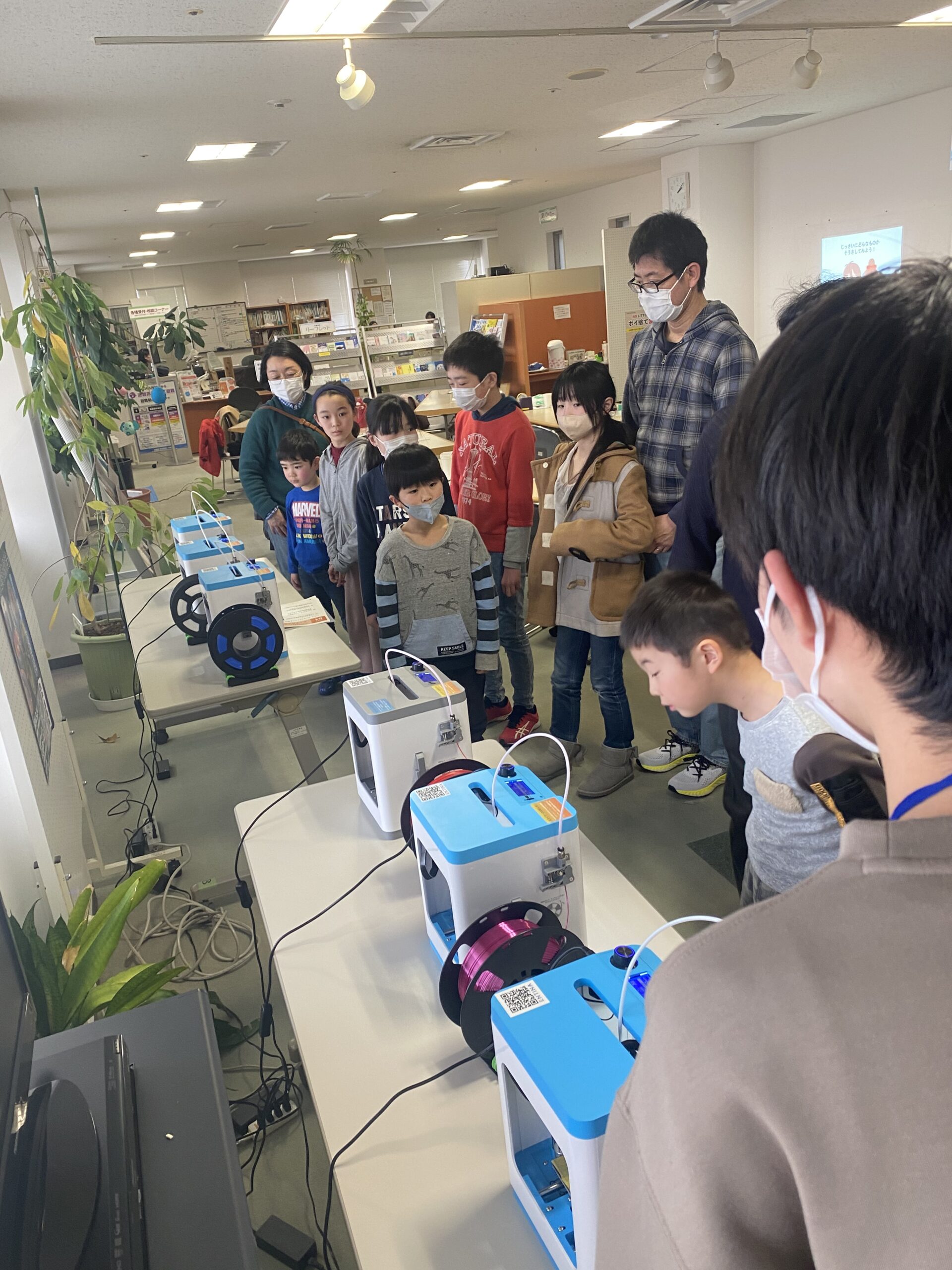 イベントでは、小学1~6年生とその保護者の方が参加しました。事前に山形大学理学部化学コースの奥野先生から3Dプリンターをお借りし、当日は3Dプリントで作成している間に、2つの実験を行い、子どもたちに楽しんでもらいました。