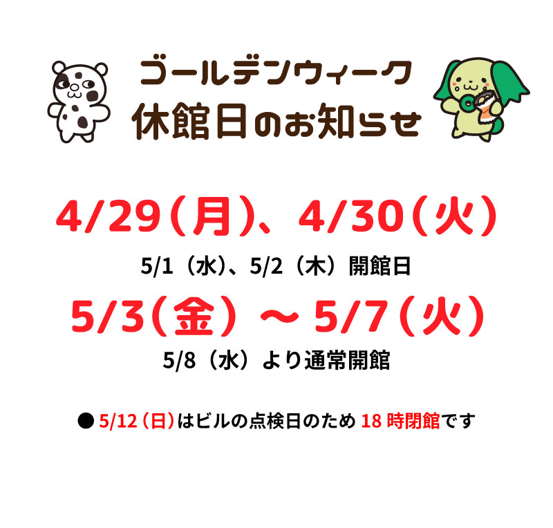 5月1日(水)、5月2日(木)は開館日、連休後は5月8日(水)から通常開館となります。