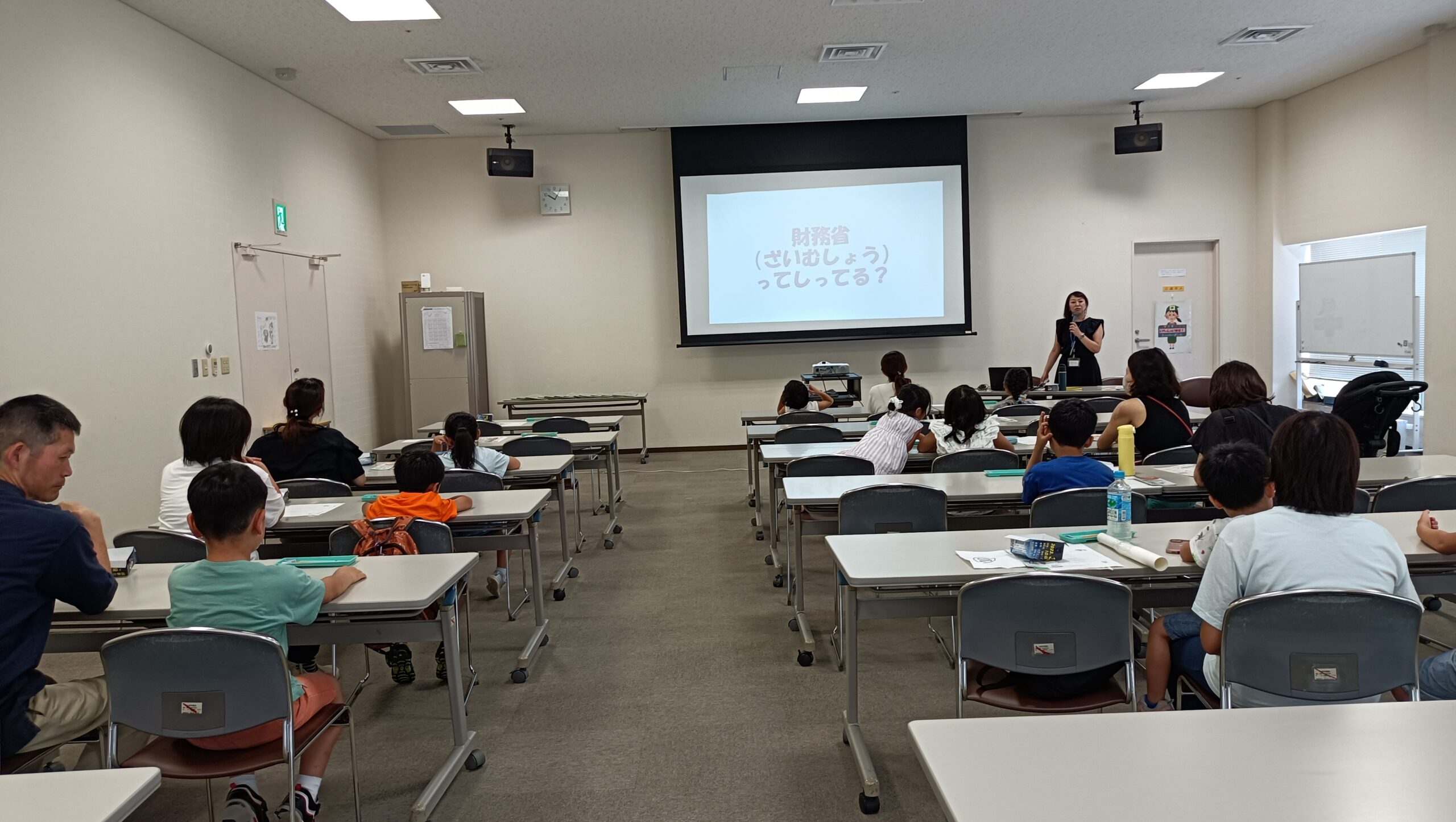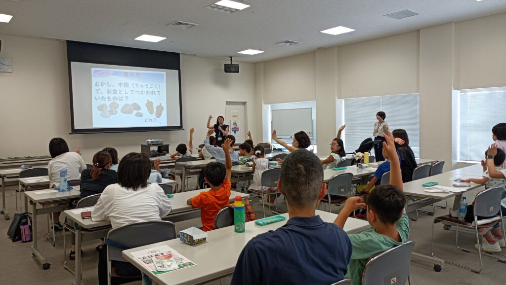 最初に「お金にかんするクイズにちょうせん!!」として3問のクイズが出題、それぞれ親子で考えながら答えをだしていました。元気よく答えを発表してくれる子どもがたくさんいて、元気な声が会場内に広がり、ワイワイと賑やかになりました。