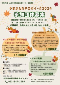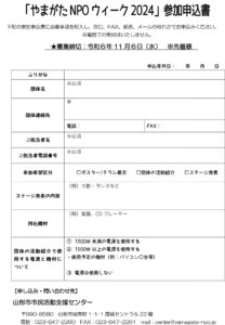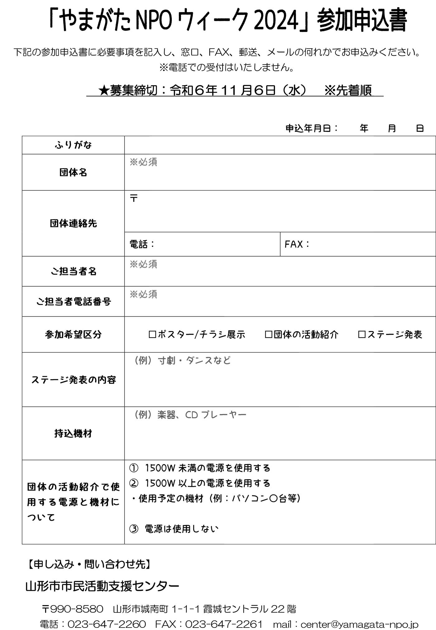 « 前の記事へ 次の記事へ » やまがたNPOウイーク2024 参加団体募集! 2024年8月30日 center チラシはこちらからダウンロード出来ます(PDF形式) 申込用紙はこちらからダウンロード出来ます(word形式) « 前の記事へ 次の記事へ »