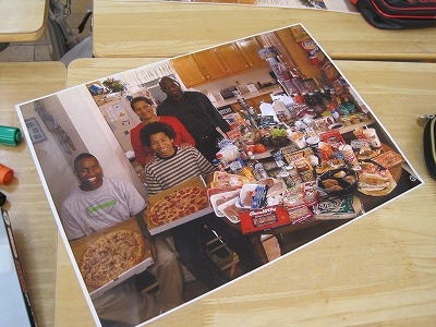 宗教、経済状況、人種や家族構成も異なる、数カ国の1週間分の食材と家族、キッチンなどが写った写真を見ながらグループで話し合うというもの。
