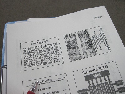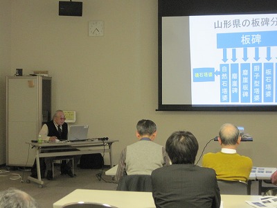 最後に、山形県の板碑※に関する研究について加藤和徳さんが発表しました。現在県内に存在する1505基の板碑の分類や分布、年代別分類などの調査結果が示され、置賜地方周辺に存在する「厨子型」の板碑についても研究経過を発表しました。
