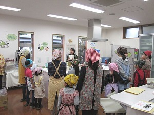 初めに講師の岡田まさえさんと佐藤富士子さんから、自己紹介と今回の料理教室の目的についてお話がありました。その後、スタッフの紹介、料理の説明になりました。特に料理の説明では、珍しい在来作物を見て子供から大人まで興味津々でした。