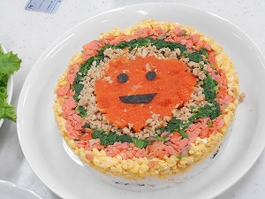 今回作った料理は、「赤根ほうれん草つや姫デコレーションすし」、「あくどいも(さといも)の豚肉ロール」、「花麩(はなふ)の掘込せり入りすまし汁」、「やわらかりんごもって菊ゼリー飾り」の4品でした。デコレーションすしは、班ごとに顔やハート形に盛り付けをするなど工夫が見られ、どれもきれいに出来上がっていました。
