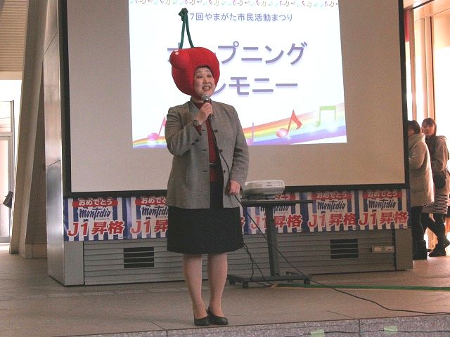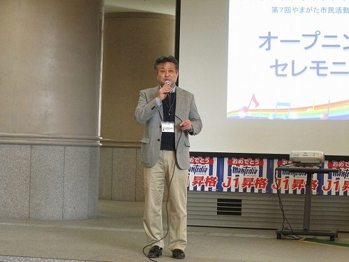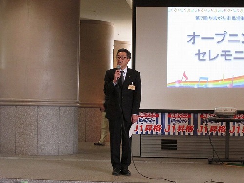 司会のNP法人山形の公益活動を応援する会・アミルの佐藤悠さんの進行のもと、第7回やまがた市民活動まつり実行委員長(山形市市民活動支援センター連絡協議会会長、山形女性医師ネットワーク)の池田こずえさんの開会の挨拶に続き、山形市企画調整課長の松田昌明さん、山形市市民活動支援センター所長の齋藤和人さんよりご挨拶を頂戴しました。