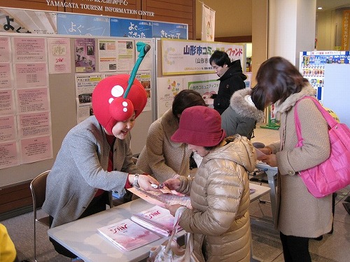 今年も、昨年度とは分野の異なる様々な団体の紹介ブースやステージ発表など、大変盛りだくさんの内容で、ご来場いただいたみなさんを最初から最後まで飽きさせないイベントになったようです。たまたま通りがかった方も、スタンプラリー企画に参加されたり、ステージ発表をご覧になったり、しばらく足をとめて「おまつり」を楽しんでいる様子でした。今年も、山形市のゆるキャラである「はながたベニちゃん」や「減量すすむくん」などが登場し、会場を盛り上げていました。