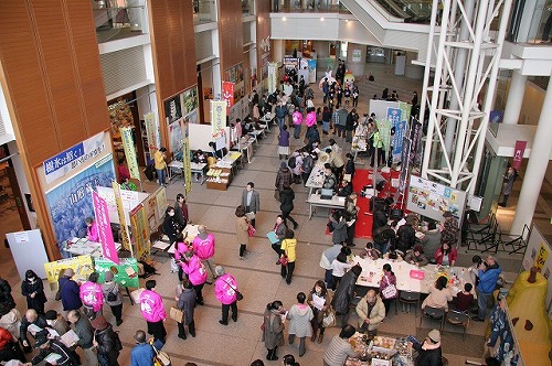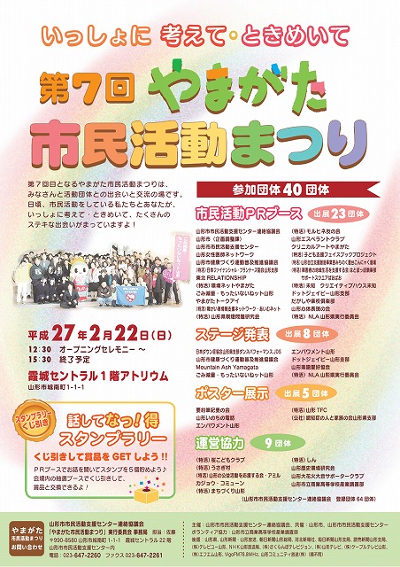 平成27年2月22日(日)12時30分から15時30分まで、山形市霞城セントラル1階アトリウムで、「第7回やまがた市民活動まつり」が開催されました。このイベントは、今年で7年目を迎えます。山形市内を中心に活動する40の市民活動団体の皆さんが参加されました。