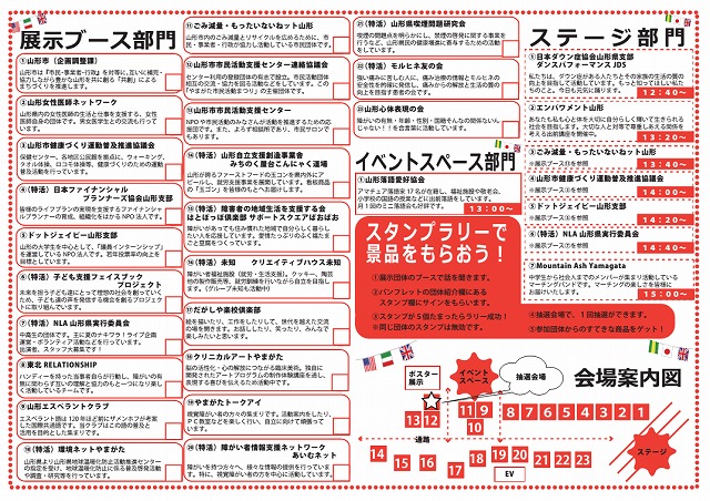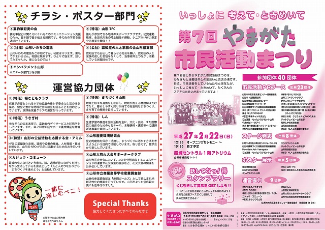 山形市(企画調整課共創係)、山形女性医師ネットワーク、山形市健康づくり運動普及推進協議会、NPO法人日本ファイナンシャルプランナーズ協会山形支部、ドットジェイピー山形支部、NPO法人子ども支援フェイスブックプロジェクト、NPO法人NLA山形県実行委員会、東北RELATIONSHIP、山形エスペラントクラブ、NPO法人環境ネットやまがた、ごみ減量・もったいないねット山形、山形市市民活動支援センター連絡協議会、山形市市民活動支援センター、NPO法人山形自立支援創造事業舎みちのく屋台こんにゃく道場、NPO法人障害者の地域生活を支援する会、はとぽっぽ倶楽部サポートスクエアぱおぱお、NPO法人未知、クリエイティブハウス未知、だがしや楽校倶楽部、クリニカルアートやまがた、やまがたトークアイ、NPO法人障がい者情報支援ネットワーク・あいむネット、NPO法人山形県喫煙問題研究会、NPO法人モルヒネ友の会