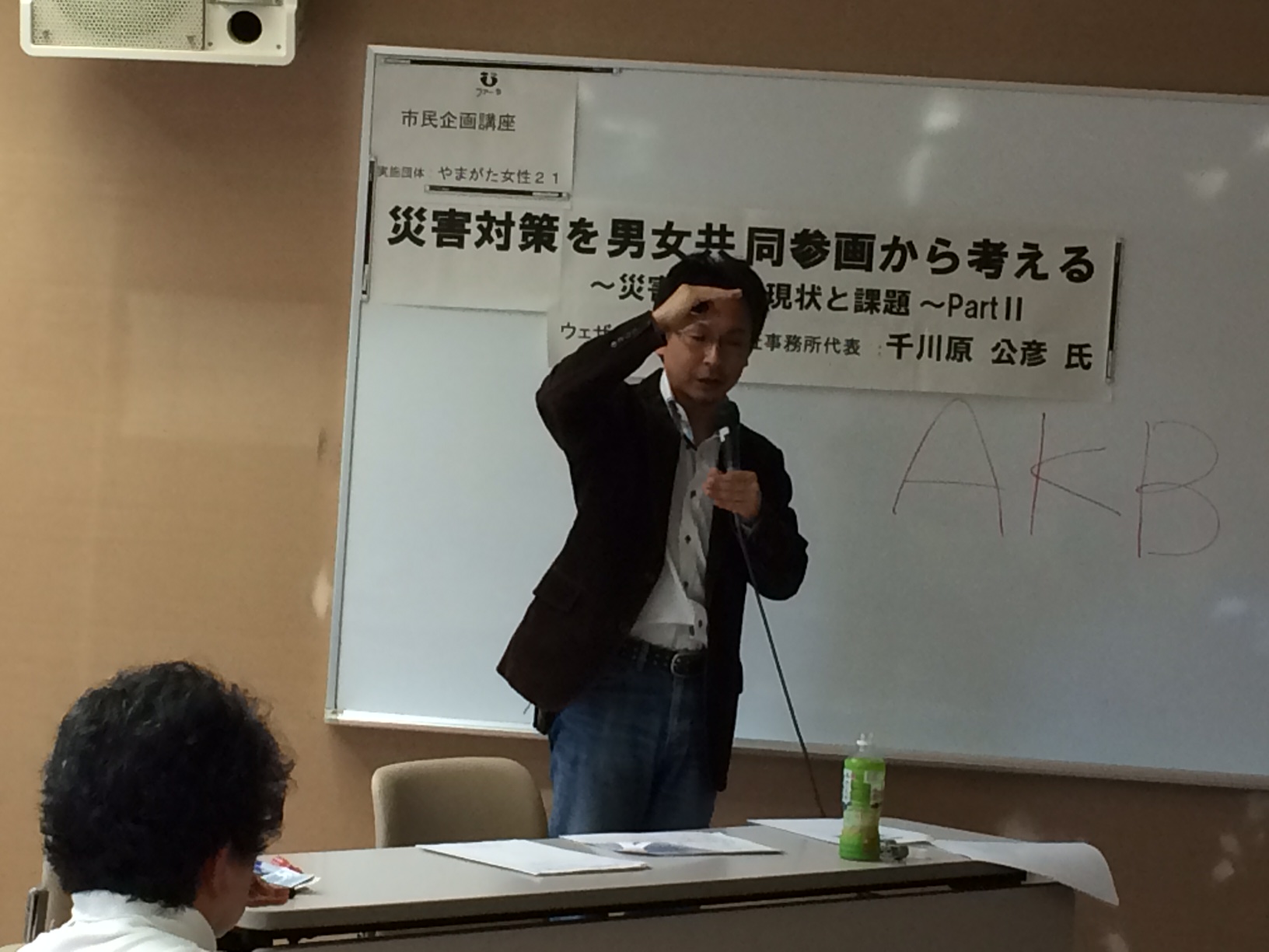 第1部の講師は、ウェザーハート災害福祉事務所代表の千川原公彦さんです。千川原さんは山形県天童市出身で、現在は宮城県富谷町を拠点に活動されているという自己紹介がありました。続いて「山形市と水害」というテーマでお話されました。山形県内でも、川があふれる、土砂崩れが起こるなどの水害が起きるようになってきたそうです。南陽市の水害は記憶に新しいところです。その原因は、豪雨が増えたこと、年数を経て川底が上がったり、枯れ葉や稲わら等で水路が詰まるなどが考えられるそうです。