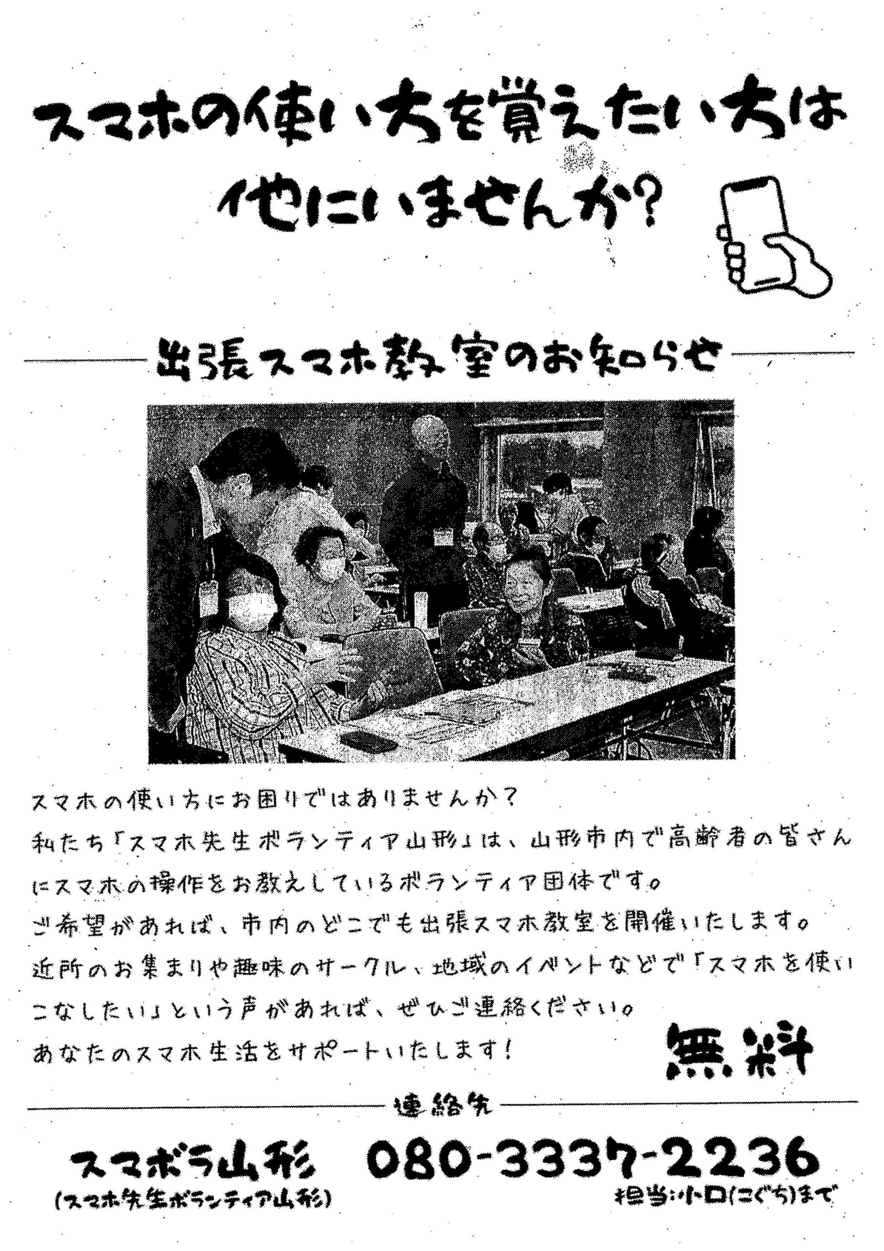 « 前の記事へ 次の記事へ » スマホの使い方を覚えたい方は他にいませんか? ~出張スマホ教室のお知らせ~ 2024年11月27日 center スマホの使い方にお困りではありませんか?私たち「スマホ先生ボラン ティア山形」は、山形市内で高齢者の皆さんにスマホの操作を教えている ボランティア団体です。 ご希望があれば、市内のどこでも出張スマホ教室を開催いたします。 近所のお集まりや趣味のサークル、地域のイベントなどで「スマホを使い こなしたい」という声があれば、ぜひご連絡ください。 あなたのスマホ生活をサポートいたします! ▶問い合わせ先 スマホ先生ボランティア山形 ・電話:080-3337-2236(担当:小口まで) ==- « 前の記事へ 次の記事へ »
