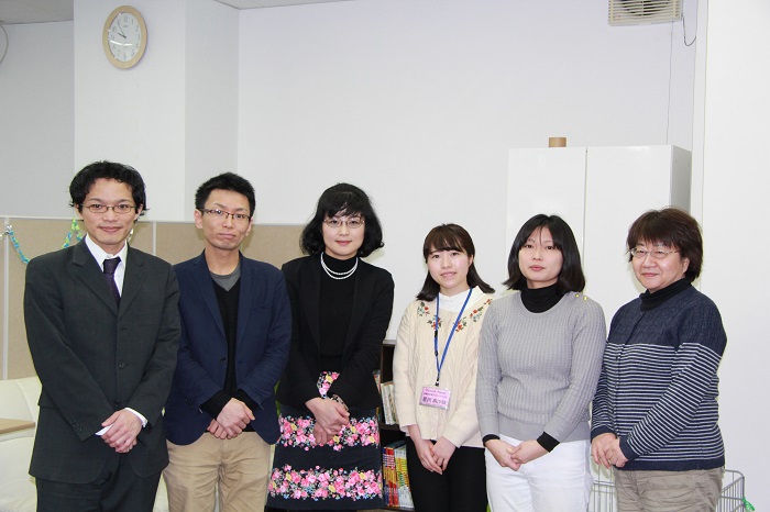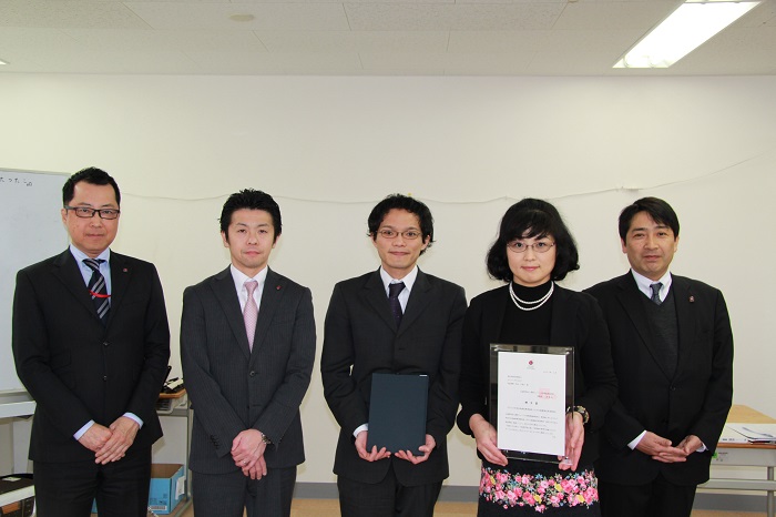 助成元である公益財団法人損保ジャパン日本興亜福祉財団より、損害保険ジャパン日本興亜株式会社山形支店から、橋本正夫さん、小関日出満さん、損保ジャパン日本興亜保険サービス株式会社から新田秀俊さんが訪れ、アジェンダやまがた代表理事の児玉千賀子さんへ目録と記念品が贈呈されました。
