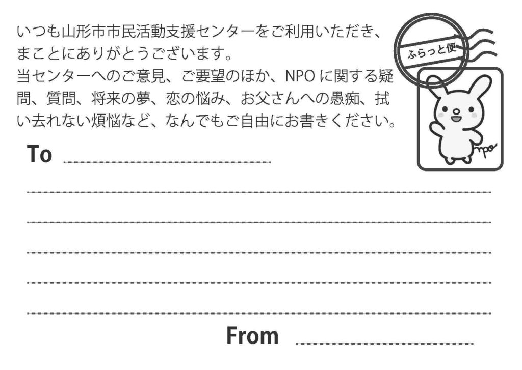 « 前の記事へ 次の記事へ » ふらっとポスト設置しました! 2025年1月22日 center 市民活動情報コーナーふらっとに、2025年1月から「ふらっとポスト」を設置しました。 NPOに関することはもちろん、センターのへの要望やご意見など、なんでも受付中です。センター内にある専用の用紙に書き込んで投函してください。 みなさんからのお便りお待ちしています。 « 前の記事へ 次の記事へ »