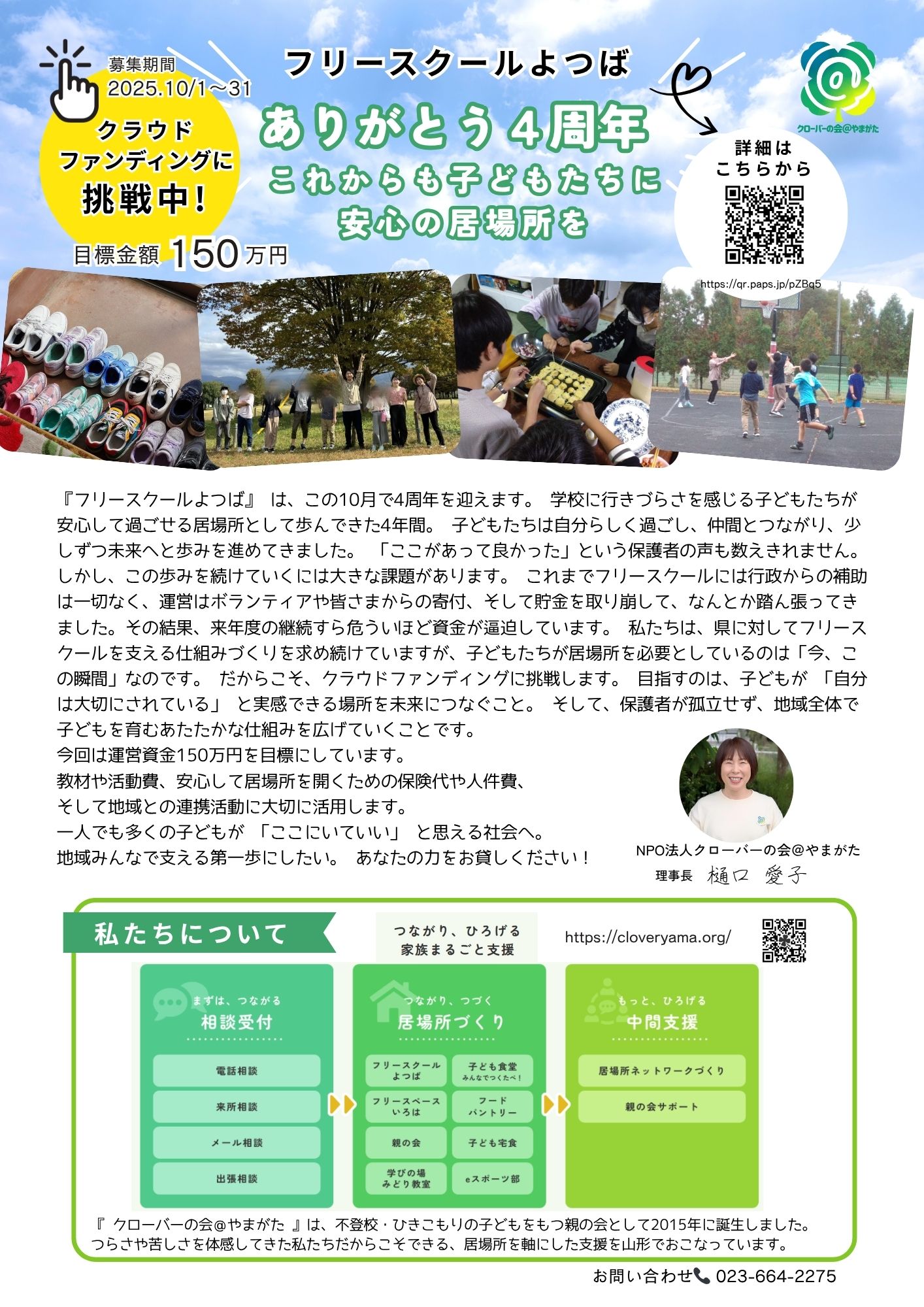 « 前の記事へ 次の記事へ » フリースクールよつば クラウドファンティング募集 2025年10月16日 center チラシはこちら→フリースクールよつば クラウドファンティング募集(PDF形式) « 前の記事へ 次の記事へ »