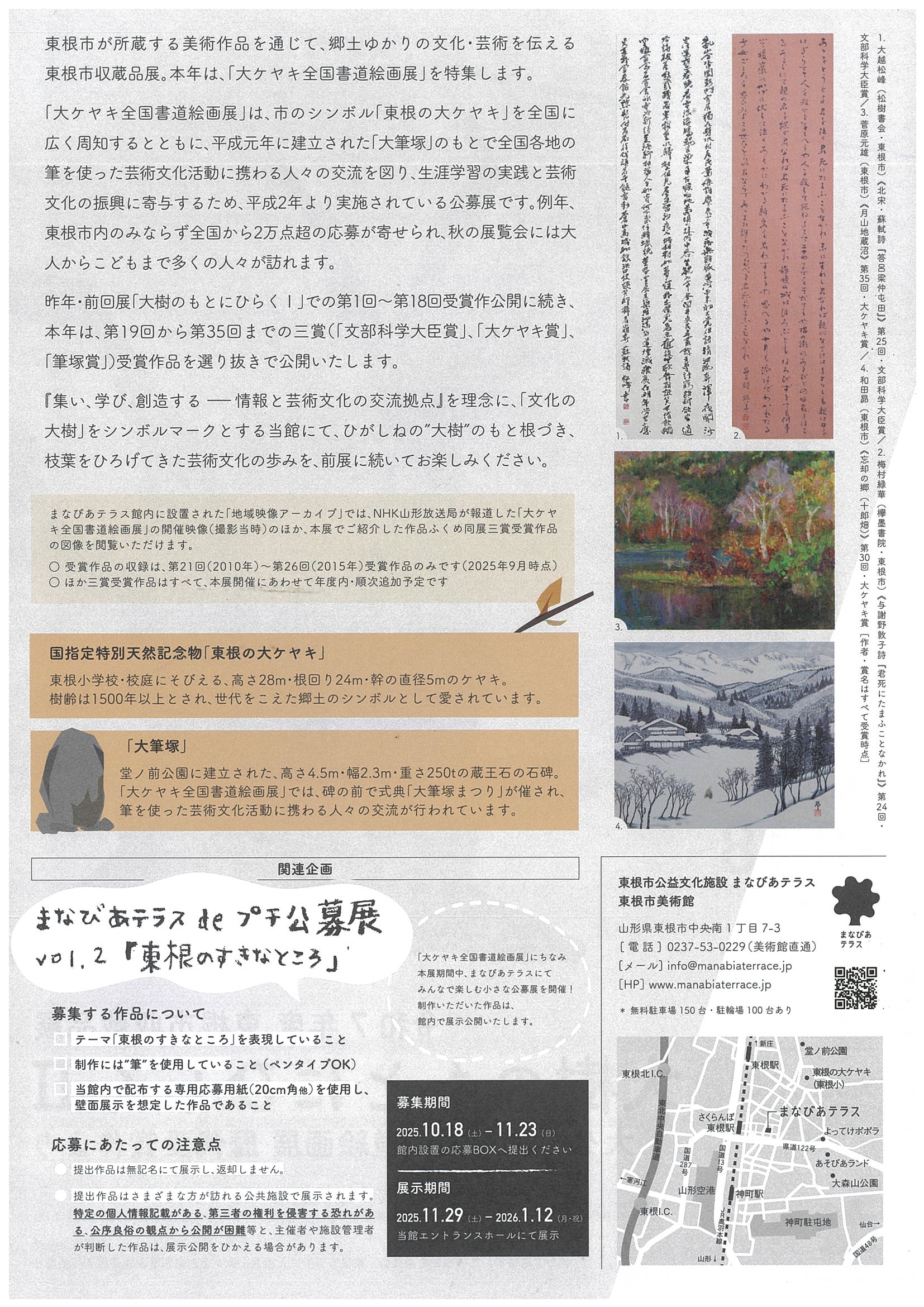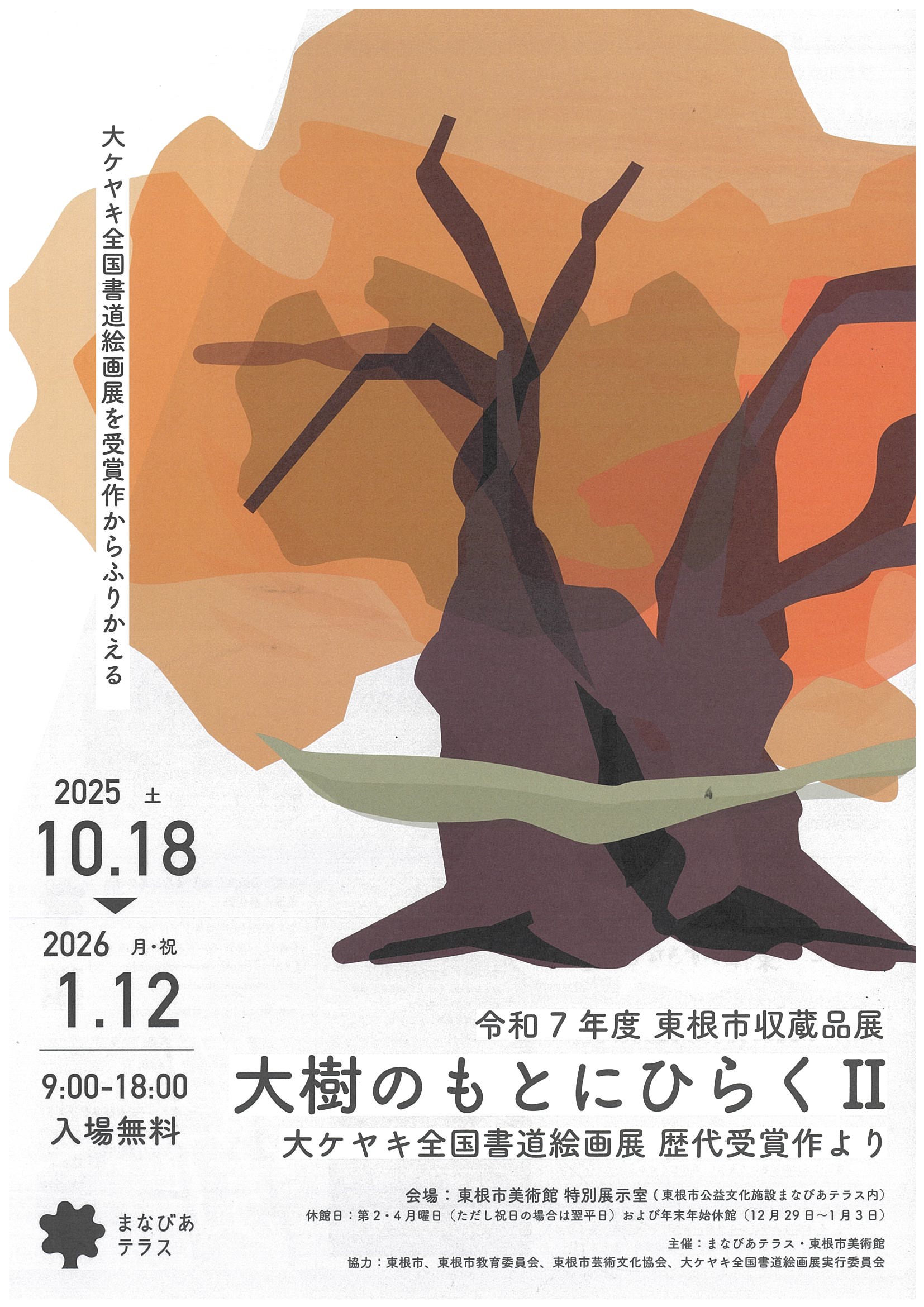 « 前の記事へ 令和7年度東根市収蔵品展 大樹のもとにひらくⅡ 大ケヤキ全国書道絵画展 歴代受賞作より 2025年10月28日 center チラシはこちら→令和7年度東根市収蔵品展(PDF形式) « 前の記事へ