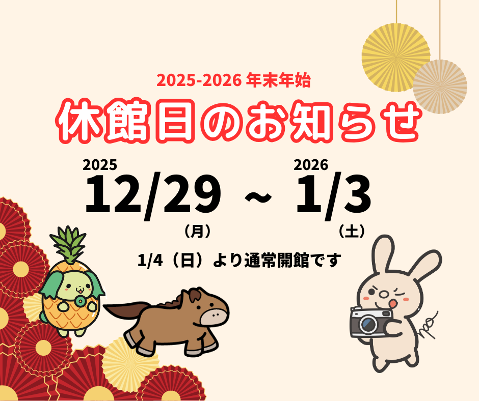 « 前の記事へ 次の記事へ » 年末年始の休館日のお知らせ 2025年12月19日 center 今年の休館日は2025年12/29(月)~2026年1/3(土)まで。 1/4(日)より通常開館です。 以降、1/5は月曜日のため休館、1/12(月)は月曜日祝日のため1/13も休館日になります。 ご利用を予定している方は事前に開館日をご確認の上ご利用ください。 本年も当センターをご愛顧いただきありがとうございました。 来年もどうぞよろしくお願いいたします。 山形市市民活動支援センター 職員一同 « 前の記事へ 次の記事へ »