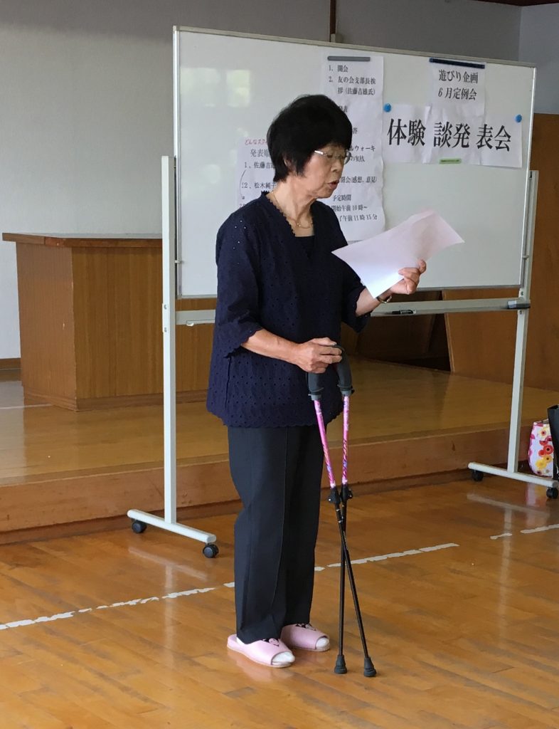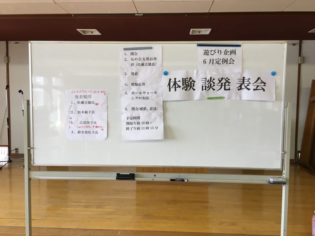 全国パーキンソン病友の会山形県支部は、県内パーキンソン病患者、家族が連帯して、医療・福祉・療養生活の充実や向上のために活動し、会員相互の親睦と交流を深めることを目的として活動しています。医療講演会やリハビリ体操、防災講演会、個別相談会などの開催を通して、病気に負けることなく元気で明るい生活が出来る様サポートしているそうです。今回の「パーキンソン病の話 体験談聞いてみませんか?」では、前半に、パーキンソン病の方から体験談を聞き、後半に、ポールウォーキングの説明と実技体験がありました。