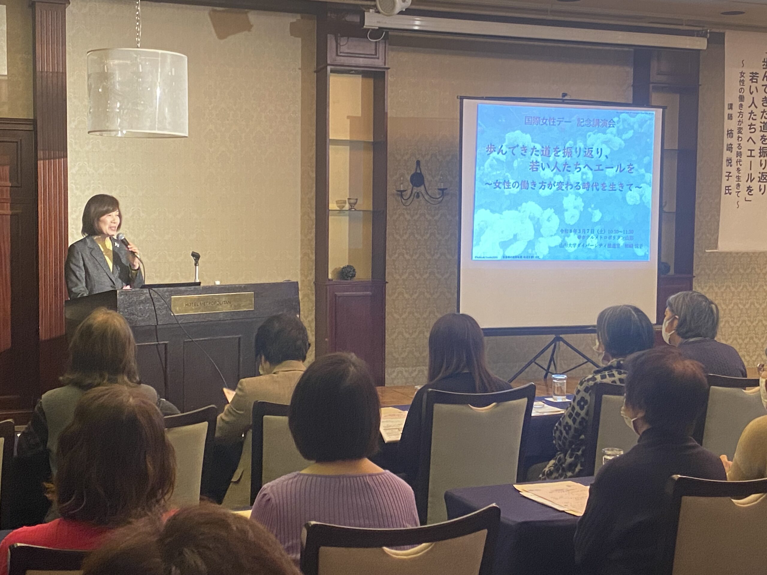 今回の講演では、ご自身の歩みを振り返りながら、女性の社会進出について「これまで」「現在」「これから」の三つの視点から話をしていただきました。これから社会が変わっていく中で私たちはどうしたらいいのか、若い女性たちにどういうアドバイスをしたらいいのかというお話でした。