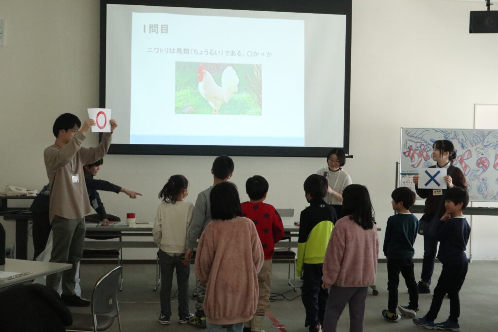 前半は「動物の分類・進化の順番」をテーマに講義やクイズを行いました。まずは現生の生物を例にあげ、動物が無脊椎動物と脊椎動物に分けることができること、そして脊椎動物の中にはさらに5つのグループがあり、それぞれのグループには特徴があることを説明しました。講義の後には、内容のおさらいとして〇×クイズ(「コウモリは鳥類である。〇か×か」など)を出題し、動物の分類についての知識を深めてもらいました。その後は、すでに絶滅してしまった古代生物のイラストを配り、それらの動物を出現順に並べてもらうゲームを行いました。古代生物でも、グループごとに現生生物と同じ特徴を持っていることを感じてもらえたと思います。