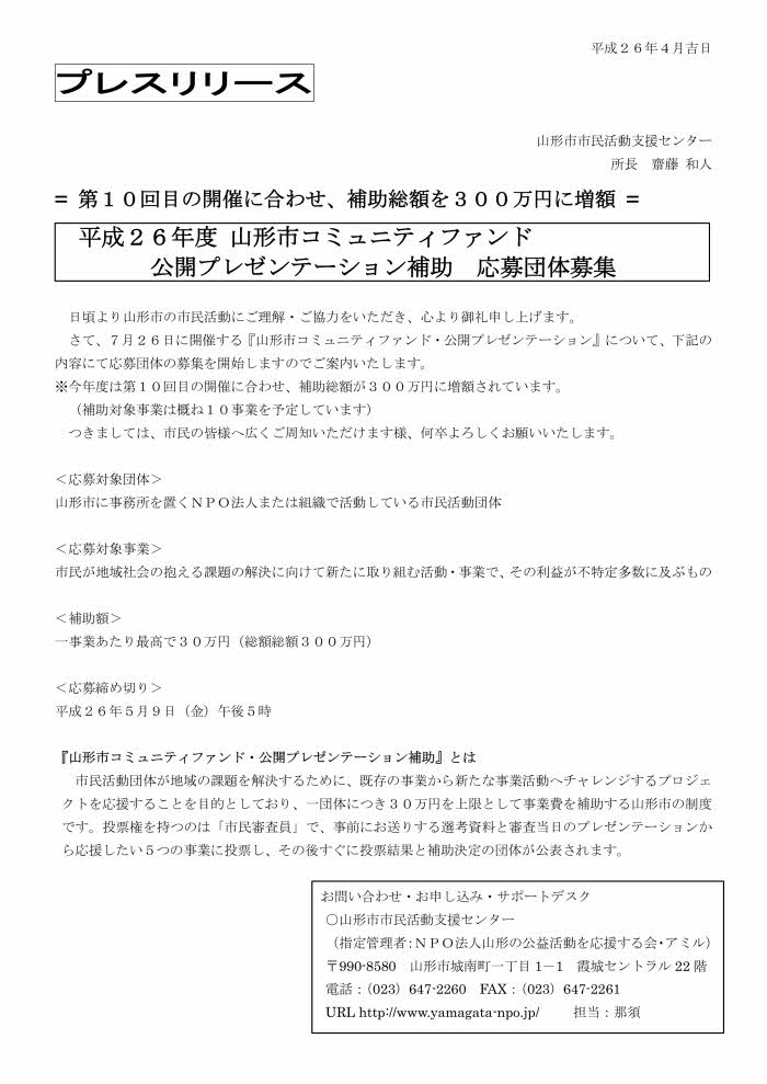 次の記事へ » 2014.4-プレスリリース「平成26年度山形市コミュニティファンド 公開プレゼンテーション補助 応募団体募集」 2014年4月30日 center (下記をクリックするとPDFがダウンロードできます) 次の記事へ »