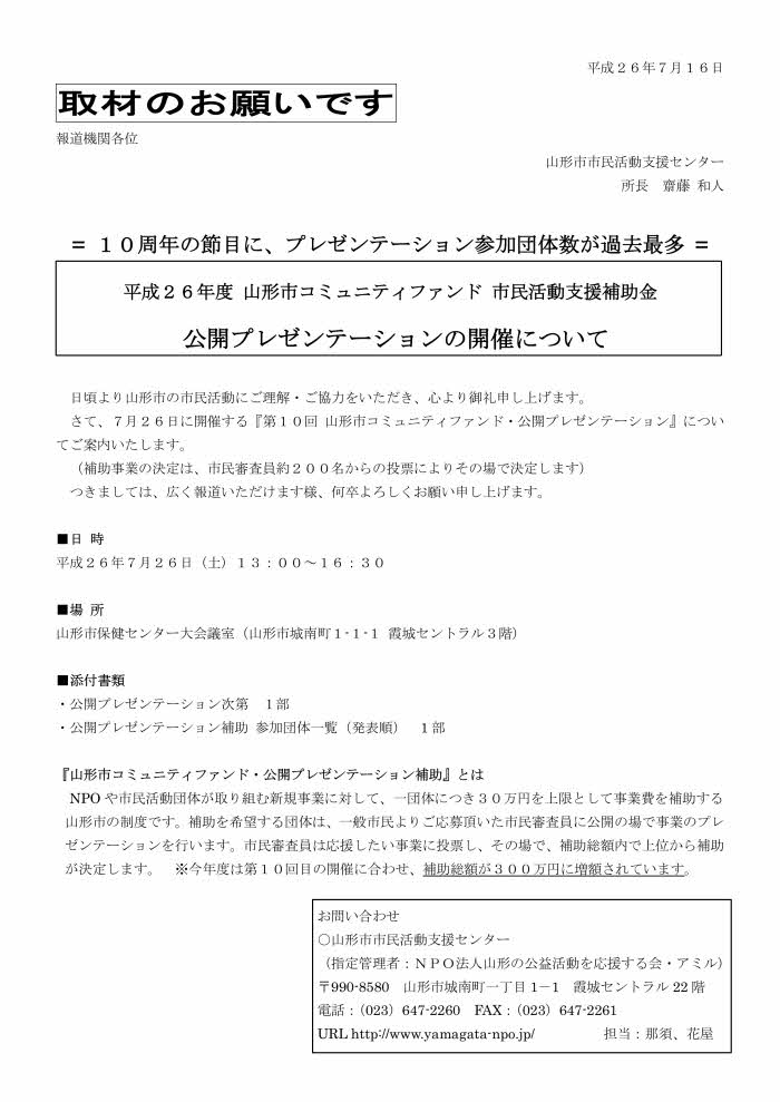 « 前の記事へ 次の記事へ » 2014.7.16-プレスリリース「平成26年度山形市コミュニティファンド 公開プレゼンテーションの開催について」 2014年7月16日 center (下記をクリックすると、添付書類と合わせてPDFがダウンロードできます) « 前の記事へ 次の記事へ »