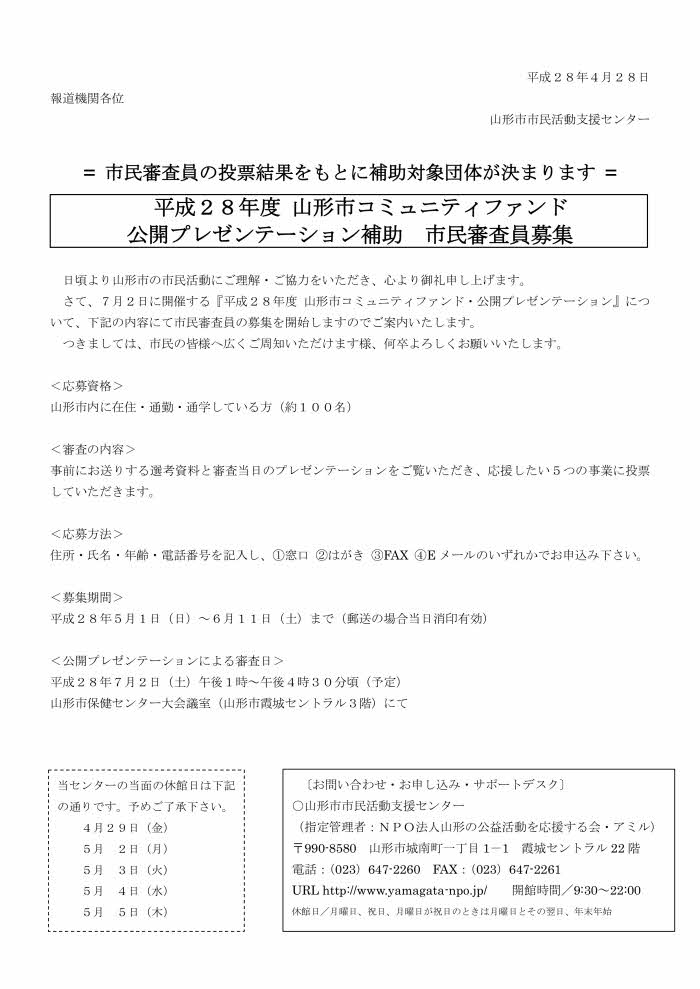 « 前の記事へ 次の記事へ » 2016.4.28-平成28年度 山形市コミュニティファンド公開プレゼンテーション補助 市民審査員募集 2016年4月28日 center (下記をクリックするとPDFがダウンロードできます) « 前の記事へ 次の記事へ »