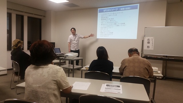 講師は、センタースタッフの佐藤が務めました。今NPOが注目されている理由や、NPOの概念、どのような組織なのか、NPOの設立と運営で気をつける点などについて、お話させていただきました。