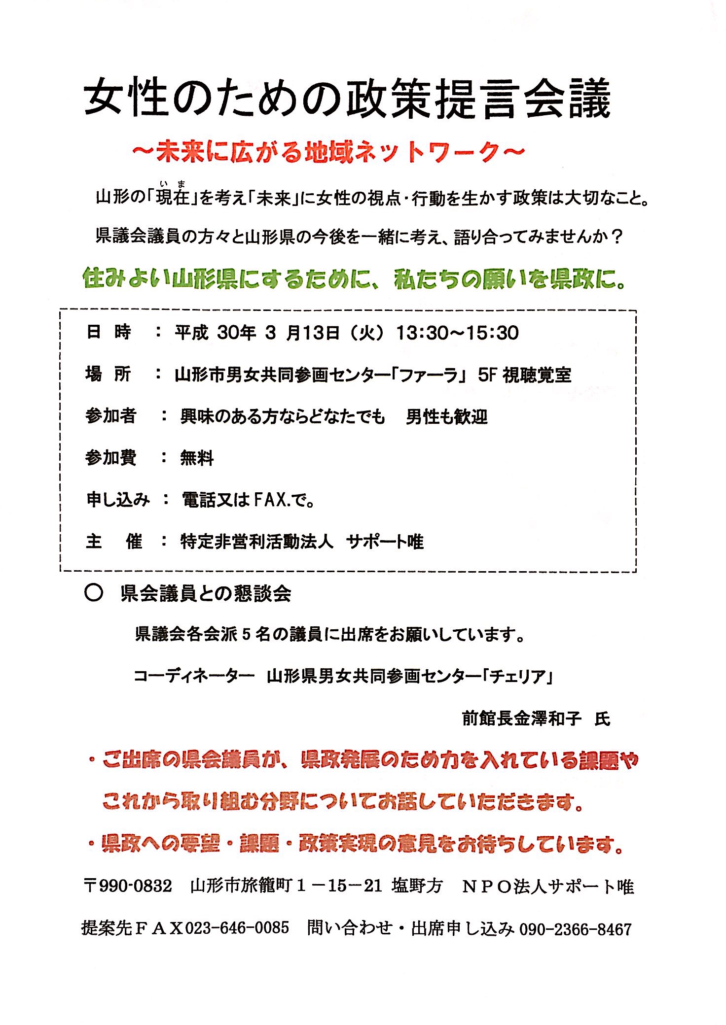 平成30年3月13日(火)山形市男女共同参画センターファーラにおいて、『女性のための政策提言塾~未来に広がる地域ネットワーク~が開催されました。特定非営利活動法人サポート唯が継続して取り組んできた事業で、今回で14回目を数えます。