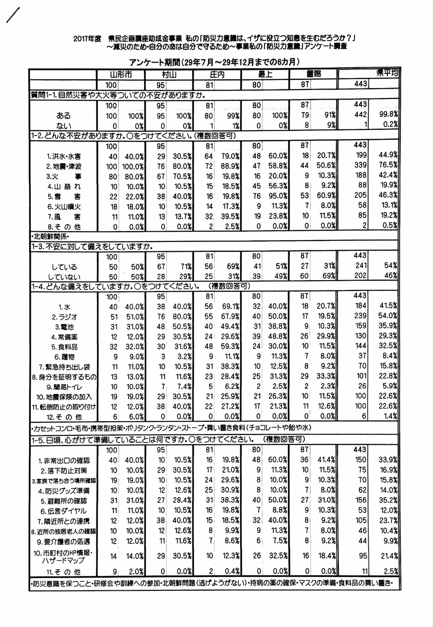 会議の中で、『私の「防災力アンケート」調査報告』の報告がありました。これは平成29年7月から12月まで、山形県民500人に対して行った調査で、443人から得られた回答をまとめたものです。