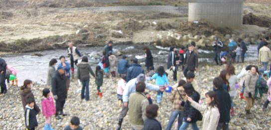明治小学校の子ども達が鮭の稚魚を放流(明治地区桜を