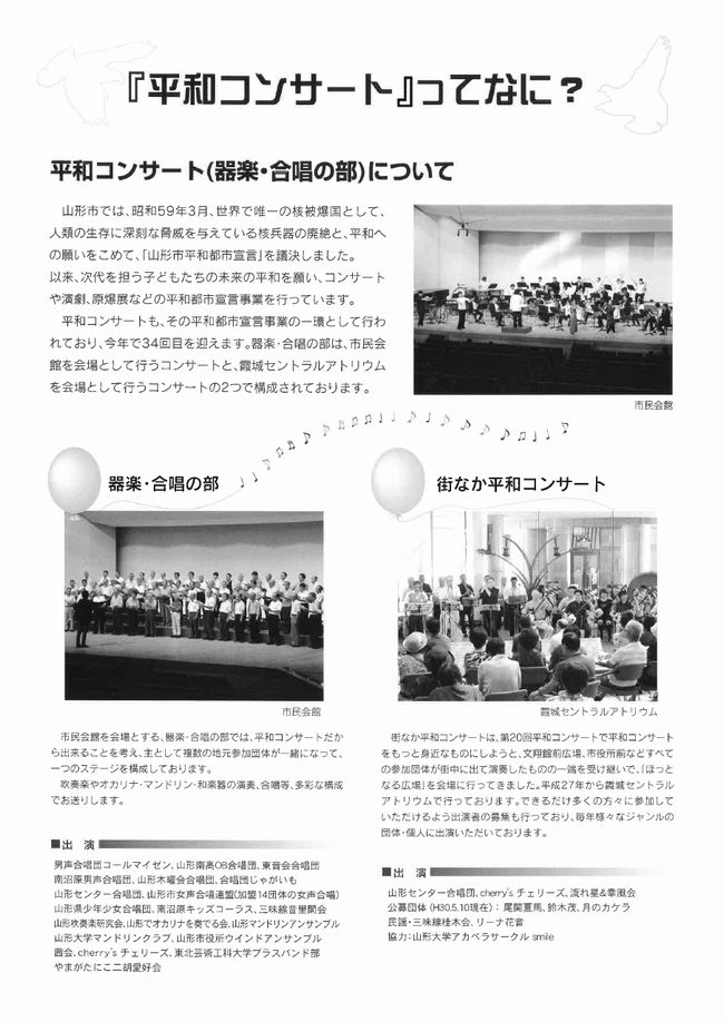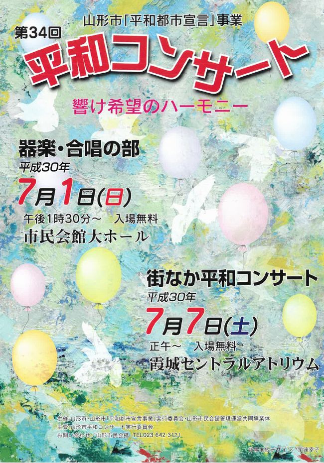 « すべてのイベント このイベントは終了しました。 第34回平和コンサート 器楽・合唱の部 2018年7月1日13:30 - 16:00 « よってって まちの縁側 第1回テーマ「お薬の服み方」 明治150年特別企画展 近代化する山形の姿&近代日本の礎を築いた山形縣人 » ・チラシPDFデータを、こちらからダウンロードすることができます + Google カレンダー+ iCal エクスポート 詳細 日付: 2018年7月1日 時間: 13:30 - 16:00 イベントカテゴリー: 団体主催 主催者 山形市平和コンサート実行委員会 会場 山形市民会館大ホール 香澄町2-9-45 山形市, 日本 + Google マップ 電話番号: 023-642-3121