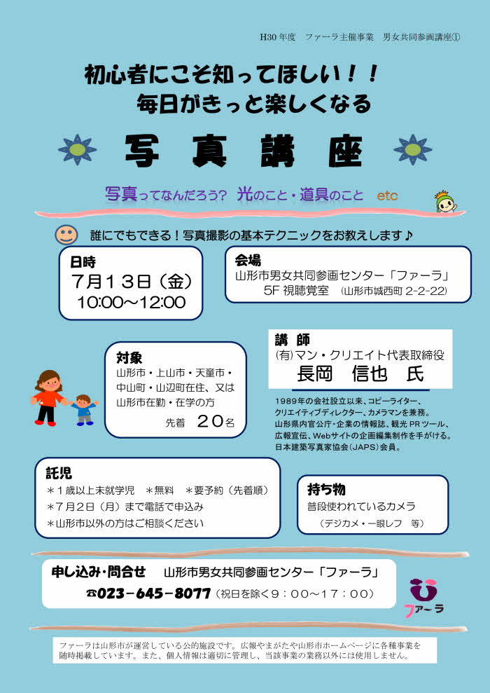 « すべてのイベント このイベントは終了しました。 初心者にこそ知ってほしい!!毎日がきっと楽しくなる写真講座 2018年7月13日10:00 - 12:00 無料 « つぶやきホッとサロン 「やまがた木育」講演会&木育カフェ » チラシはこちらからダウンロードできます(PDFデータ) + Google カレンダー+ iCal エクスポート 詳細 日付: 2018年7月13日 時間: 10:00 - 12:00 参加費: 無料 イベントカテゴリー: 団体主催 Web サイト: http://www.city.yamagata-yamagata.lg.jp/kakuka/kikaku/danjosenta/ibento/shashinkouzadanjo.html 主催者 山形市男女共同参画センター ファーラ 電話番号: 023-645-8077 会場 山形市男女共同参画センター ファーラ 5階 視聴覚室 山形県山形市城西町2-2-22 山形市総合福祉センター内 山形市, 山形県 9900832 日本 + Google マップ