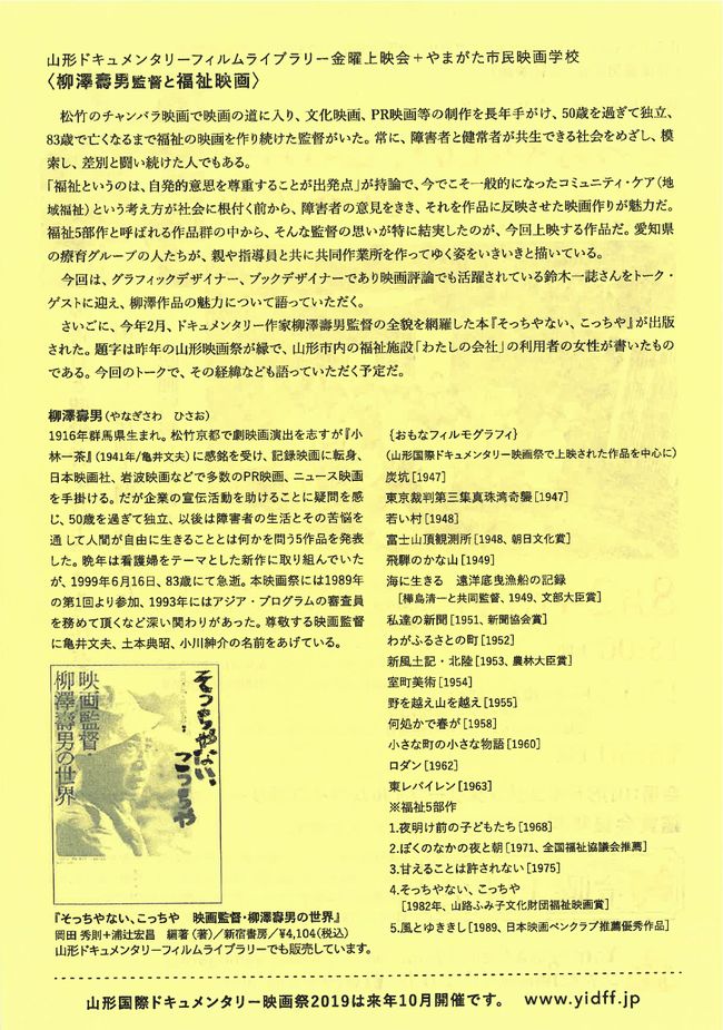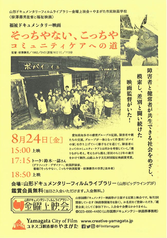« すべてのイベント このイベントは終了しました。 福祉ドキュメンタリー映画 「そっちやない、こっちや コミュニティケアへの道」 2018年8月24日 « パソコンお悩み相談室 パソコンお悩み相談室 » ・チラシPDFデータは、こちらからダウンロードすることができます + Google カレンダー+ iCal エクスポート 詳細 日付: 2018年8月24日 イベントカテゴリー: 団体主催 主催者 認定NPO法人山形国際ドキュメンタリー映画祭 電話番号: 023-666-4480 メール: info@yidff.jp Web サイト: http://www.yidff.jp/ 会場 山形ドキュメンタリーフィルムライブラリー(山形ビッグウィング3階) 平久保100 山形市, 山形県 Japan + Google マップ