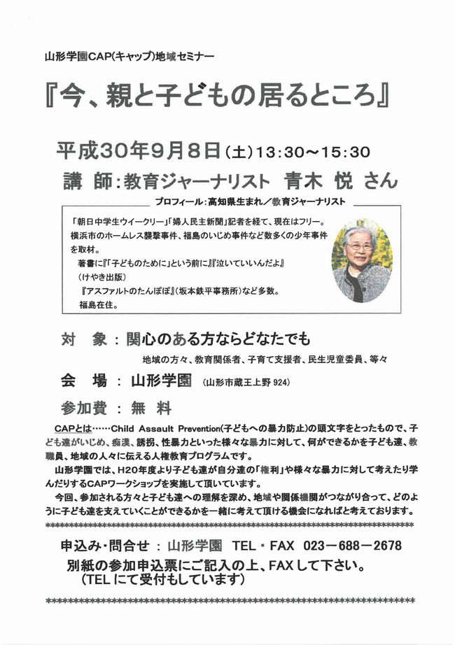« すべてのイベント このイベントは終了しました。 セミナー『今、親と子どもの居るところ』 2018年9月8日13:30 - 15:30 « NPO勉強会 私らしい未来予想図を描こう講座 » ・チラシPDFデータは、こちらからダウンロードすることができます + Google カレンダー+ iCal エクスポート 詳細 日付: 2018年9月8日 時間: 13:30 - 15:30 イベントカテゴリー: 団体主催 主催者 山形学園 電話番号: 023-688-2678 会場 山形学園 蔵王上野924 山形市, + Google マップ