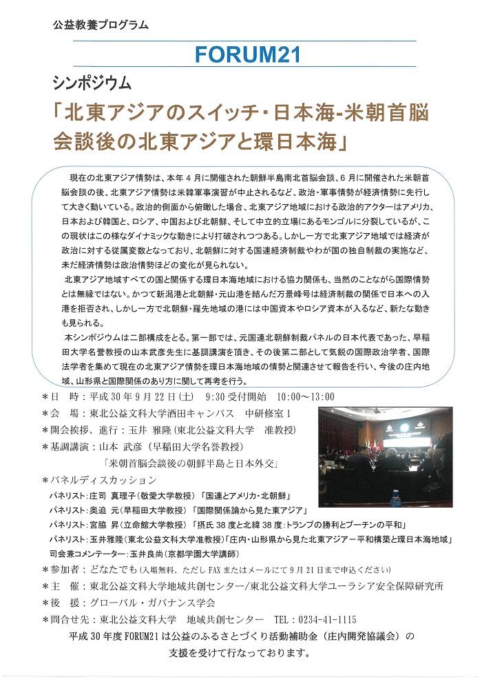 « すべてのイベント このイベントは終了しました。 公益教養プログラム FORUM21『北東アジアのスイッチ・日本海-米朝首脳会談後の北東アジアと環日本海』 2018年9月22日09:30 - 13:00 « 山形ビエンナーレ2018×YIDFF2019プレ・イベント「シネマ通りの夜」 結城泰作氏のペン画で観る山形の洋館 » チラシPDFデータはこちらからダウンロードできます + Google カレンダー+ iCal エクスポート 詳細 日付: 2018年9月22日 時間: 09:30 - 13:00 イベントカテゴリー: 団体主催 Web サイト: http://www.koeki-u.ac.jp/news_topics/forum21_20180922.html 主催者 東北公益文科大学 地域共創センター 電話番号: 0234-41-1115 Web サイト: http://www.koeki-u.ac.jp/public_relations/chiiki-kyoso-center/ 会場 東北公益文科大学 酒田キャンパス 山形県酒田市飯森山三丁目5番地の1 + Google マップ 電話番号: 0234-41-1111 Web サイト: http://www.koeki-u.ac.jp/