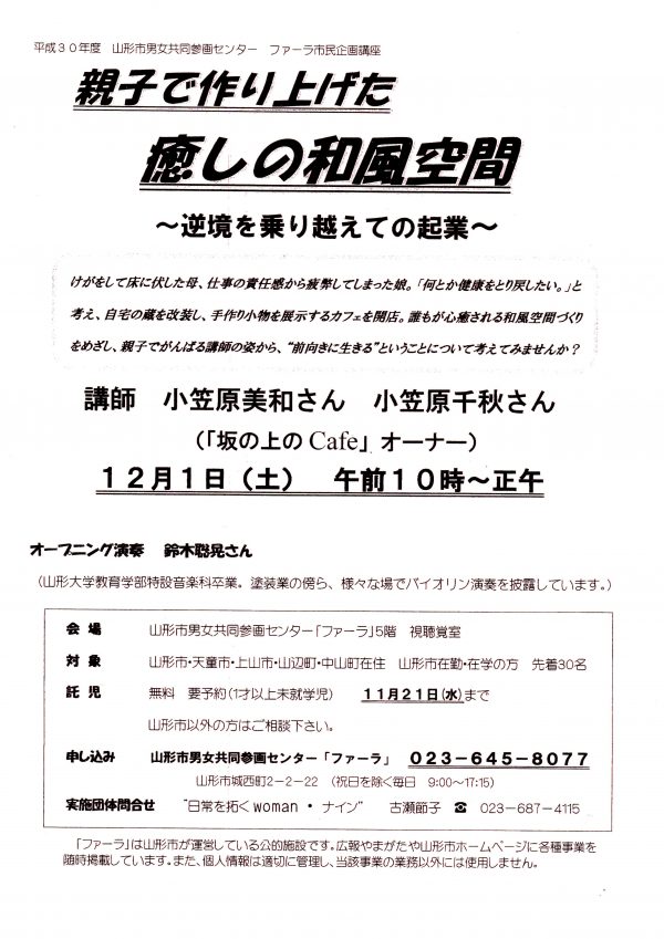 « すべてのイベント このイベントは終了しました。 親子で作り上げた癒しの和風空間~逆境を乗り越えての企業~ 2018年12月1日10:00 - 12:00 « 2018やまがたNPOウィーク 子ども食堂って? » チラシはこちらからダウンロードできます(PDF形式) + Google カレンダー+ iCal エクスポート 詳細 日付: 2018年12月1日 時間: 10:00 - 12:00 イベントカテゴリー: 団体主催 主催者 山形市男女共同参画センター ファーラ 電話番号: 023-645-8077 会場 山形市男女共同参画センター「ファーラ」 城西町2-2-22 山形市, 山形県 Japan + Google マップ