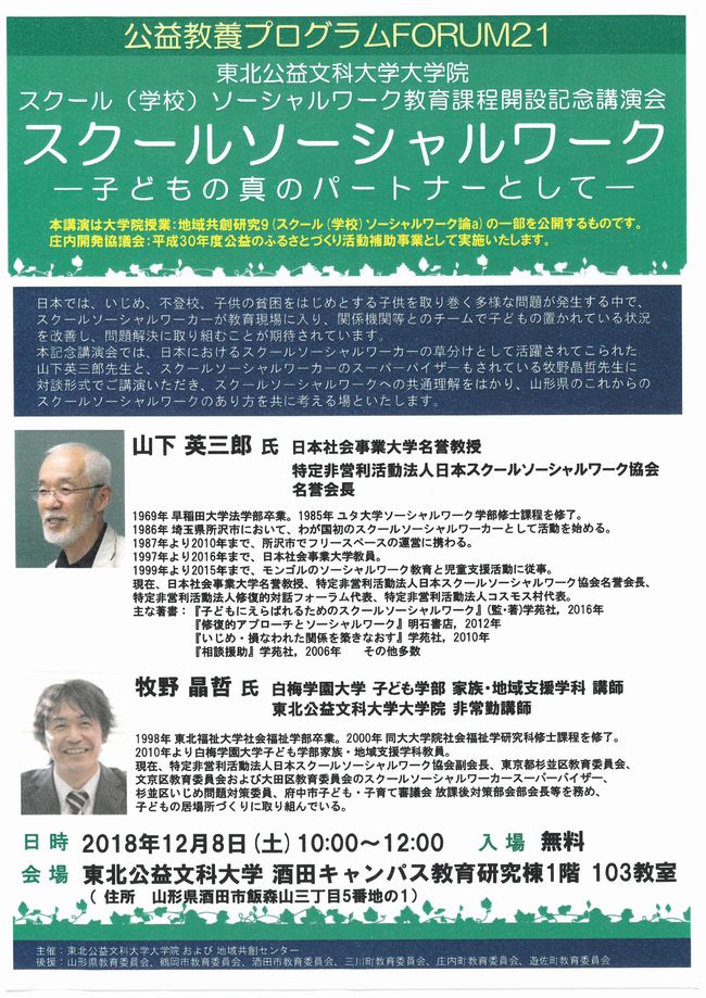 « すべてのイベント このイベントは終了しました。 スクールソーシャルワーク ~子どもの真のパートナーとして~ 2018年12月8日10:00 - 12:00 « つぶやきホッとサロン エコ住宅基礎講座 » チラシは、こちらからダウンロードできます(PDF形式) + Google カレンダー+ iCal エクスポート 詳細 日付: 2018年12月8日 時間: 10:00 - 12:00 イベントカテゴリー: 団体主催 主催者 東北公益文科大学 大学院事務室 電話番号: 0235-29-0555 Web サイト: http://gs.koeki-u.ac.jp/ 会場 東北公益文科大学 鶴岡キャンパス 山形県鶴岡市馬場町14番1号 + Google マップ 電話番号: 0235-29-0555 Web サイト: http://gs.koeki-u.ac.jp/